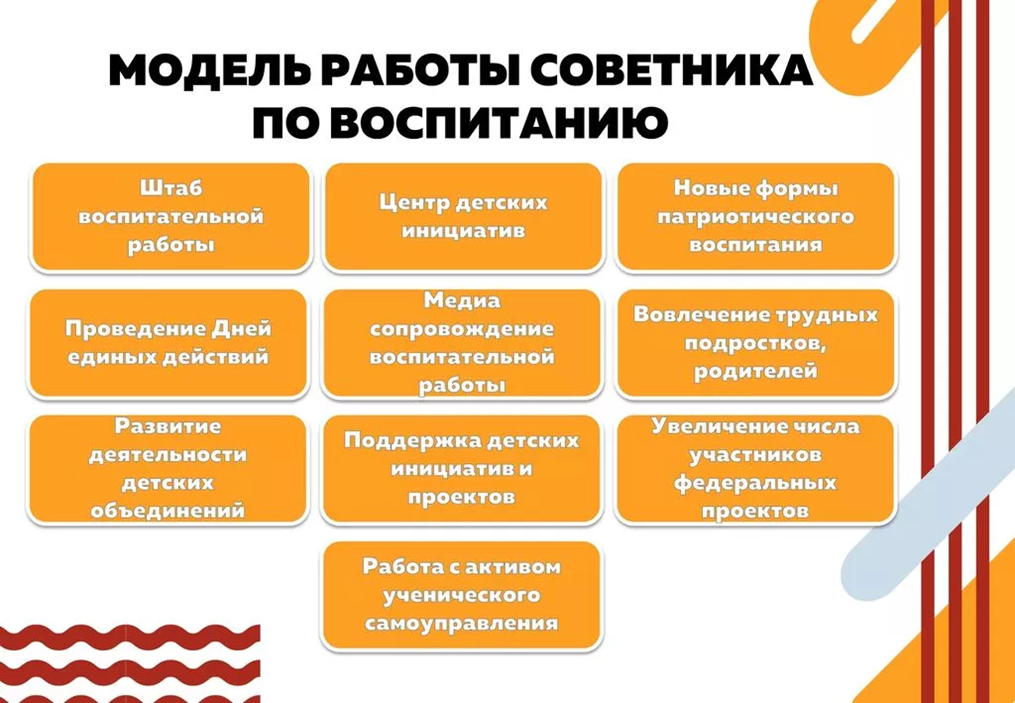 Советник директора по воспитанию и взаимодействию с детскими общественными объединениями (советник по воспитанию) в школе участвует в стратегическом планировании развития воспитательной деятельности, вовлекает обучающихся в общественно значимые проекты и в иную внеучебную деятельность. Его обязанности установлены должностными инструкциями, утверждёнными руководителями образовательных организаций